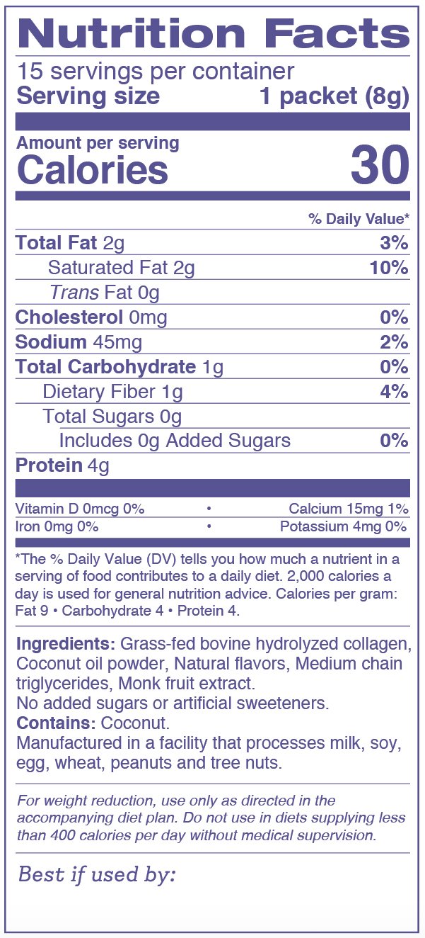 Grass-fed hydrolyzed collagen, Coconut oil powder, Natural flavors, Medium chain triglycerides, Monk fruit extract. No added sugars or artificial sweeteners.